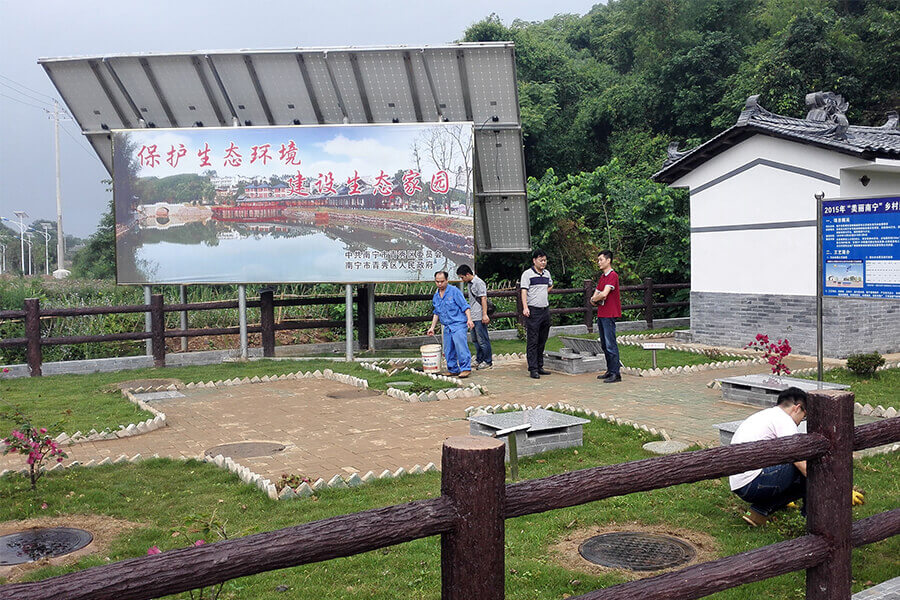 古岳坡污水处理项目采用ZY-M双膜式膜生物反应器+太阳能发电工艺,该工艺的主要优点是:项目投资省、占地少,建设周期短,处理效果好,自动化程度高,运行费用低,易于维护管理。项目厂区投资45万元,每天处理80吨生活污水,项目建成投入使用,很好地解决了古岳坡当地村民的生活污水处理问题。